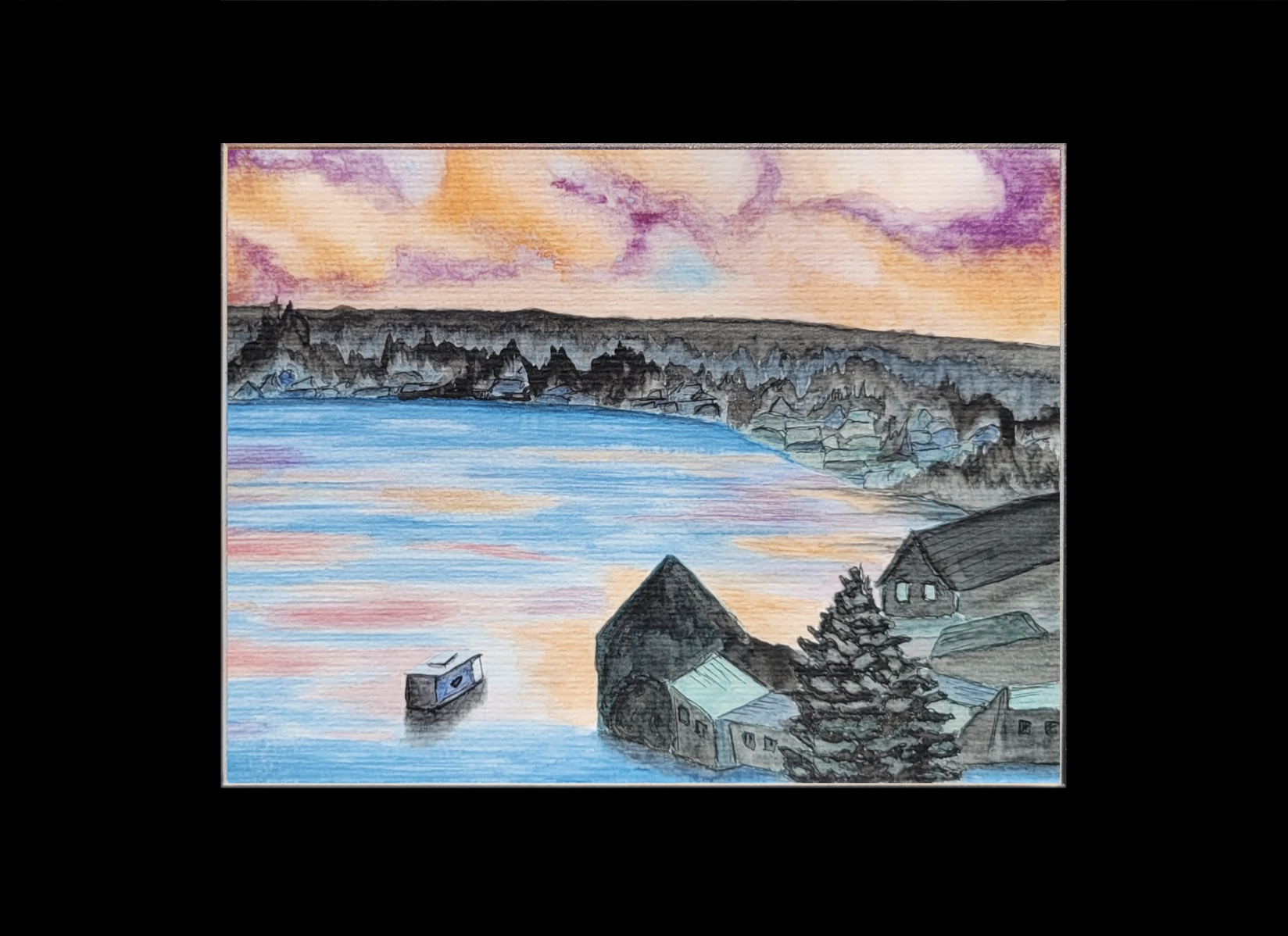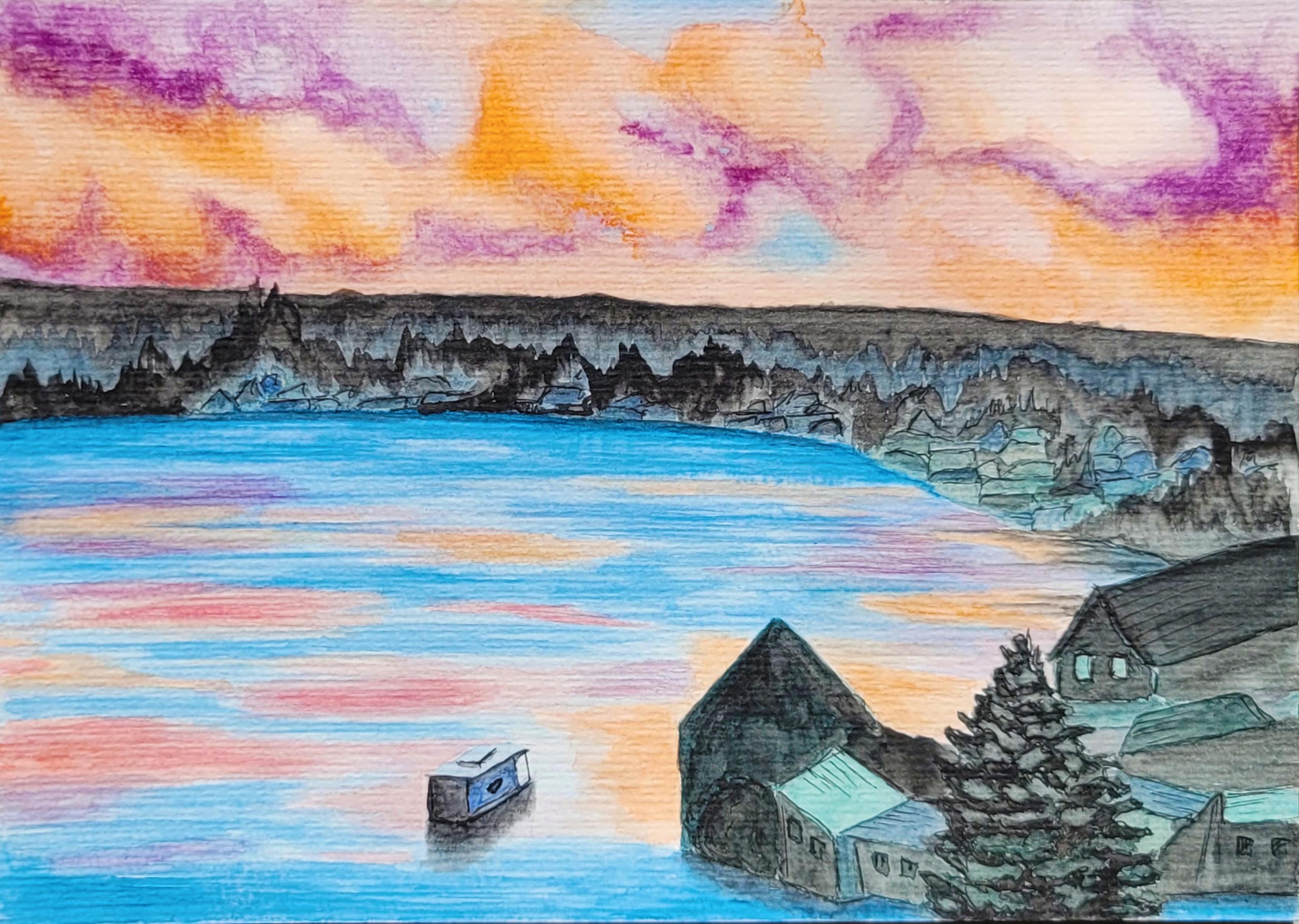 Rechtliche Informationen: Product name: Bucht in der Dämmerung. PRODUCT INFORMATION: Dieses Produkt ist ein Kunstwerk und für dekorative Zwecke vorgesehen. Es ist kein Spielzeug und nicht für Kinder unter 14 Jahren geeignet. Enthält keine Kleinteile oder verschluckbaren Teile, die eine Erstickungsgefahr darstellen könnten. Nur für den Gebrauch in Innenräumen geeignet. Farben und Materialien entsprechen den geltenden EU-Vorschriften. TECHNISCHE DETAILS: Papiergemälde: hochwertiges Aquarellpapier, Aquarellfarben, lichtbeständig. VERANTWORTLICHE ANBIETERin: Bettina Holz Art, E-Mail: info@bettinaholz.art, Adress: Postfach 740233, 13092 Berlin, Deutschland
