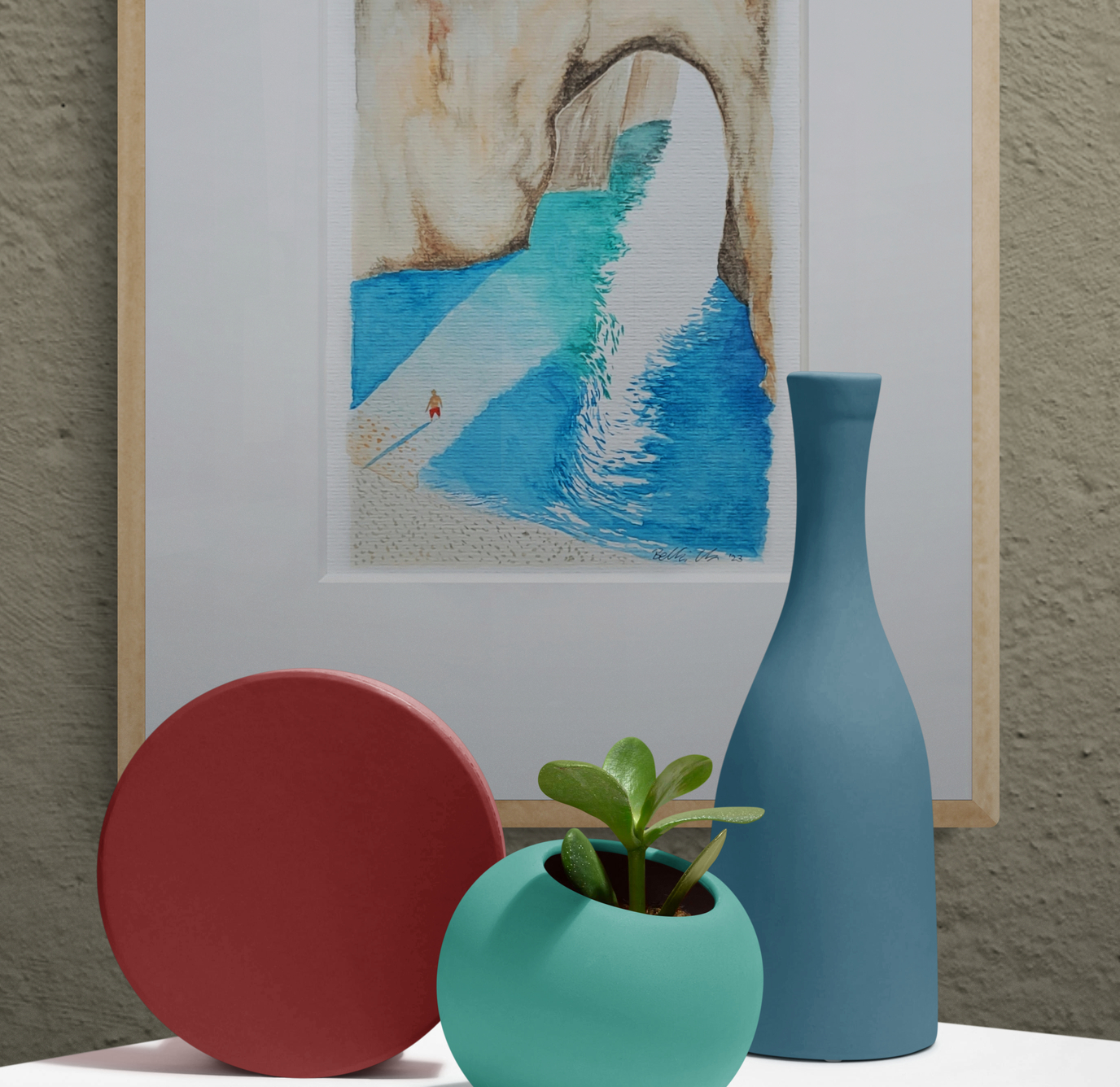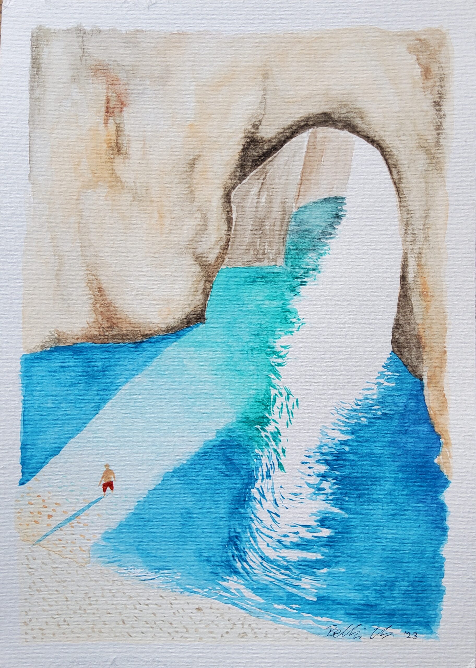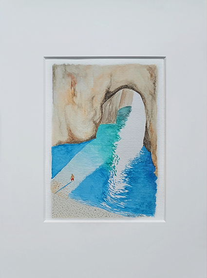 Das Aquarell „Caveman“ ist von den wunderschönen Felsstränden Italiens inspiriert. Es weckt meine Sehnsucht nach Sonne, Meer und unbeschwerten Urlaubstagen. Natürlich ist dieser einsame Strand in Zeiten des Overtourism ein Traum … ein geheimer Ort, noch unentdeckt. Aquarelle auf Papier, Das Aquarell „Caveman“ ist von den wunderschönen Felsstränden Italiens inspiriert. Es weckt meine Sehnsucht nach Sonne, Meer und unbeschwerten Urlaubstagen. Natürlich ist dieser einsame Strand in Zeiten des Overtourism ein Traum … ein geheimer Ort, noch unentdeckt. Ich liebe dieses kleine Werk so sehr, dass es auch als Druck in verschiedenen Größen erhältlich ist. Aquarelle auf Papier,  2022 17 x 24, in einem weißen Passepartout von 30 x 40 cm