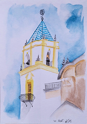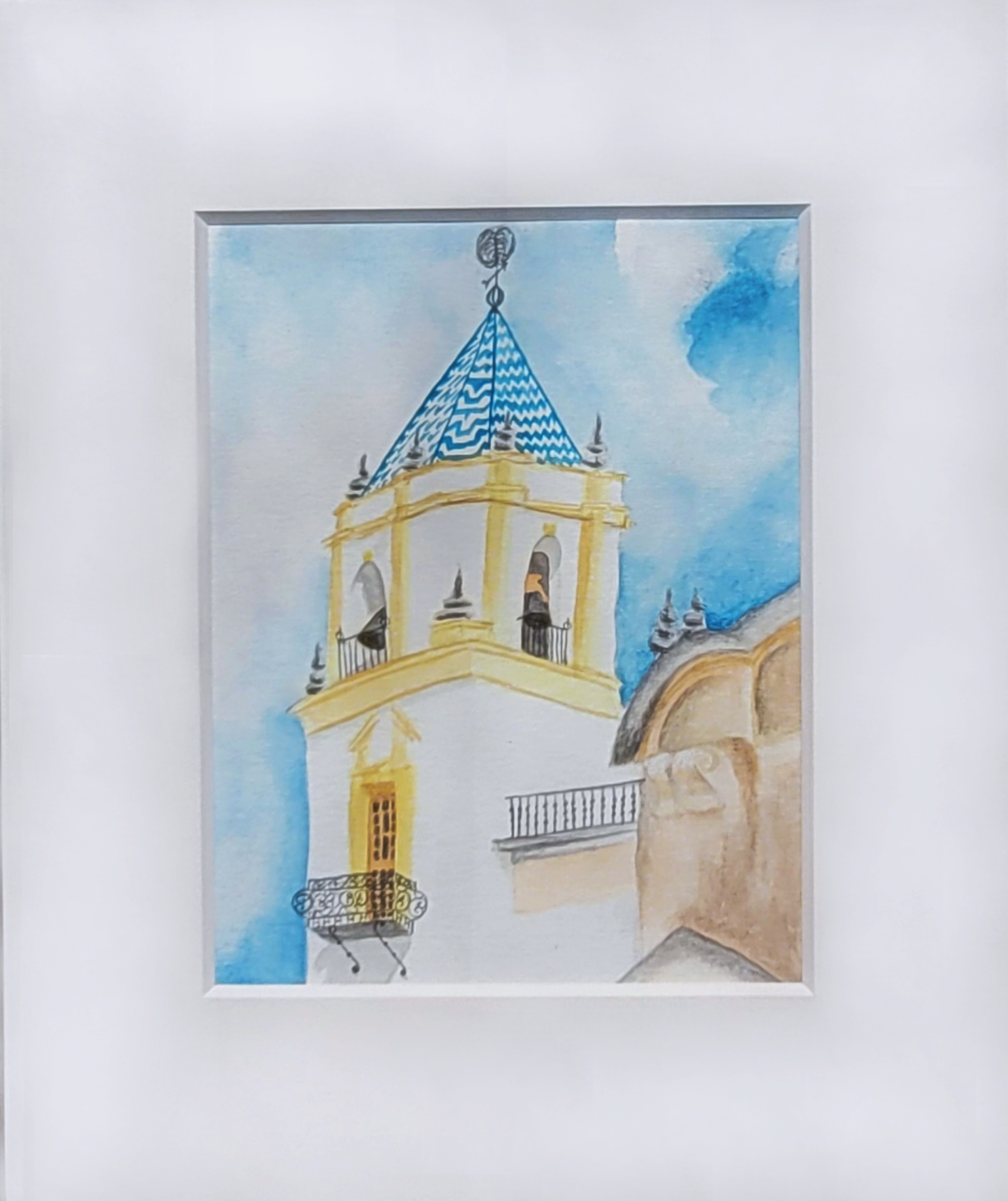 Rechtliche Informationen: Product name: Spanischer Turm. PRODUCT INFORMATION: Dieses Produkt ist ein Kunstwerk und für dekorative Zwecke vorgesehen. Es ist kein Spielzeug und nicht für Kinder unter 14 Jahren geeignet. Enthält keine Kleinteile oder verschluckbaren Teile, die eine Erstickungsgefahr darstellen könnten. Nur für den Gebrauch in Innenräumen geeignet. Farben und Materialien entsprechen den geltenden EU-Vorschriften. TECHNISCHE DETAILS: Papiergemälde: hochwertiges Aquarellpapier, Aquarellfarben, lichtbeständig. VERANTWORTLICHE ANBIETERin: Bettina Holz Art, E-Mail: info@bettinaholz.art, Adress: Postfach 740233, 13092 Berlin, Deutschland