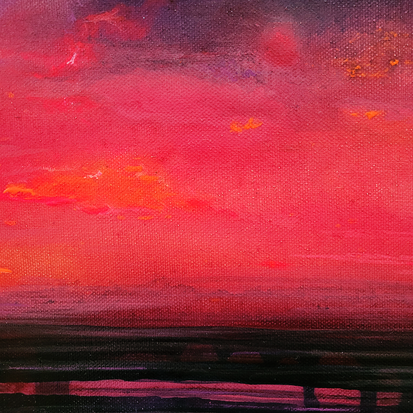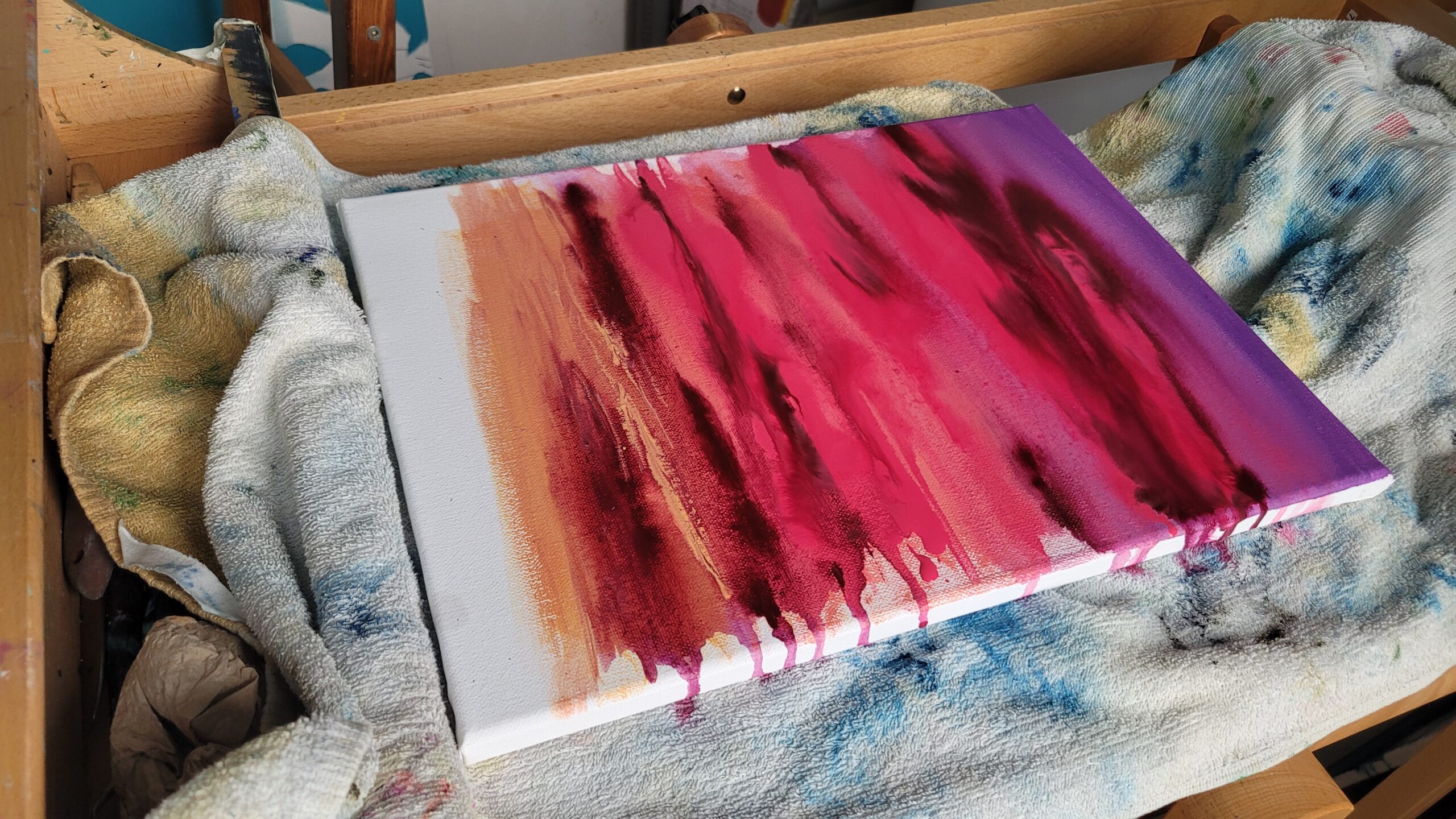 Ich gebe es zu, ich bin süchtig. Nach Sonnenuntergängen. In allen Farben und Varianten. Hier in einer knalligen Version aus Pink, Orange und Lila. Das dunkelblaue Meer ist nur angedeutet und lässt Raum für Interpretation. Ich habe mit sehr flüssigen Acrylfarben gearbeitet und immer wieder neue Schichten aufgetragen, bis ich endlich zufrieden war. Es hat ewig gedauert und ergab ein ganz schönes Farbspektakel auf meinem Boden 🤣