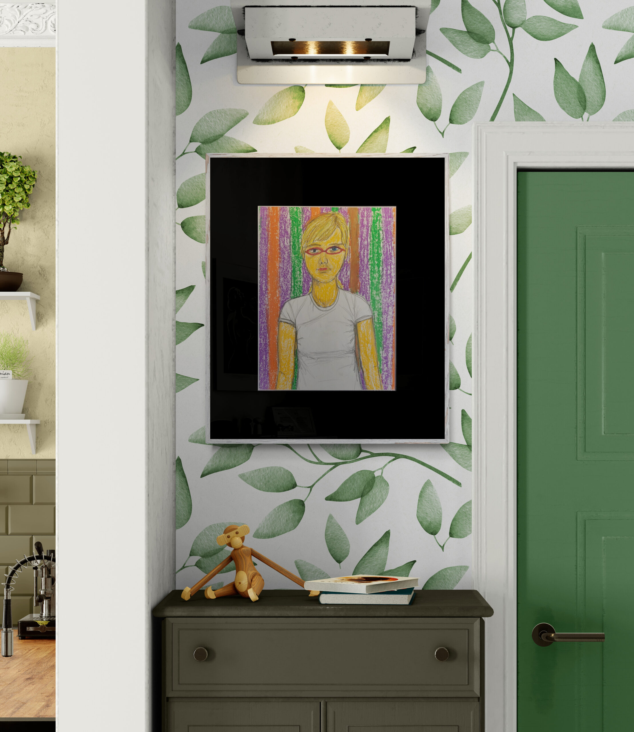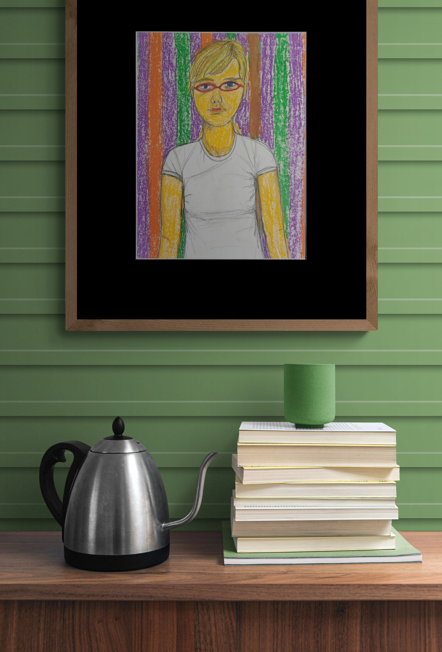 Product name: Selbstportrait mit Brille und Streifen PRODUCT INFORMATION: Dieses Produkt ist ein Kunstwerk und für dekorative Zwecke vorgesehen. Es ist kein Spielzeug und nicht für Kinder unter 14 Jahren geeignet. Enthält keine Kleinteile oder verschluckbaren Teile, die eine Erstickungsgefahr darstellen könnten. Nur für den Gebrauch in Innenräumen geeignet. Farben und Materialien sind ungiftig und entsprechen den geltenden EU-Vorschriften. TECHNISCHE DETAILS: Papiergemälde: Hochwertiges Künstlerpapier, Ölpastellkreiden, lichtbeständig. VERANTWORTLICHER ANBIETER: Bettina Holz Art, E-Mail: info.bettinaholz@gmail.com, Adress:Postfach 740233, 13092 Berlin, Deutschland